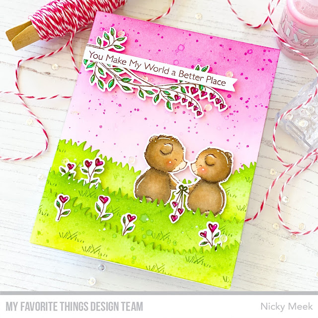 My take on this week's challenge was to use the Grassy Hills Die-namics to create the wavy lines at the bottom. These sections were individually ink blended and distressed with water and paint splashes before being backed with foam tape and applied to a background panel that had been ink blended and distressed using MFT's Poppin' Pink Ink.