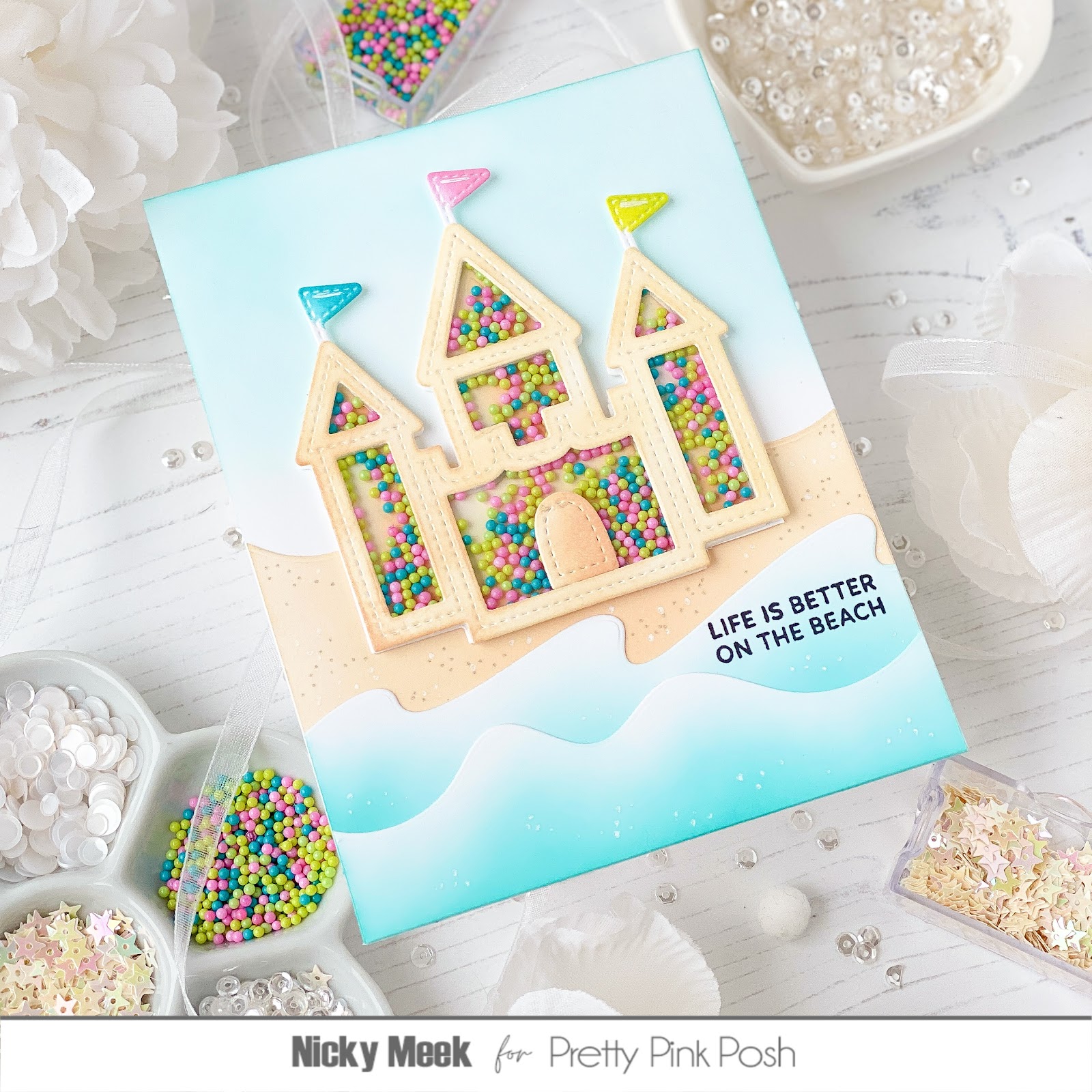 Time to create the Sandcastle shaker using the new die. I stacked the various die cuts and glued in stacks, finishing with acetate and one more die cut which I ink blended to match the sand. I added strips of foam and filled with the new Summer Fun Shaker Beads before sealing it close with the acetate and the final frame on top. I glued the shaker unit to the background.